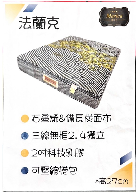 舒曼特-法蘭克石墨烯床墊 舒曼特-法蘭克石墨烯床墊 尺寸:單人~雙人加大能捲起方便攜帶 注意事項 1.尺寸皆為手工量測,存在些微誤差,請依照實際商品尺寸為主2.如欲訂購此商品,請再連絡我們為您報價 法蘭克石墨烯床墊